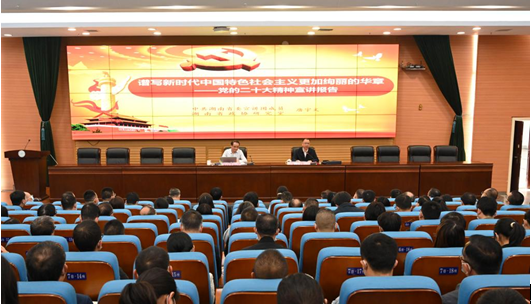 2022年11月9日上午,学习贯彻党的二十大精神省委宣讲团报告会在我校图书馆报告厅举行。党委书记李建奇主持报告会。省委宣讲团成员、省政协研究室主任唐宇文作宣讲报告。全体校领导参加宣讲会,副科以上干部、全体辅导员和学生代表在现场听取宣讲报告。